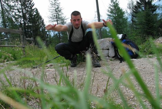 Um 17.30 h gehe ich wieder los. Zum dritten Mal heute. Ich rechne mir aus, wieviel Höhenmeter exakt benötigt werden. Eigentlich wollte ich bis zur Falzalm, die liegt auf ca. 1620 Meter. Aber die letzten Meter sind für mein Knie nicht gut zu gehen (abwärts). Also rechne ich, wie hoch für wieviel Meter insgesamt. Ich komme auf 9920 Höhenmeter, wenn ich bis zur Wetterstation vor der Alm gehen würde (tatsächlich habe ich mich etwas verrechnet). Ich komme mir schwerfälliger vor beim Gehen, irgendwann kommt mir ein Trupp entgegen, die hatte ich auch schon mehrfach heute gekreuzt. Was die wohl denken, weshalb ich sie erst beim runtergehen überhole und jetzt wieder auf halber Strecke nach oben unterwegs bin ? Ich merkte jetzt auch beim Aufstieg das Knie, nicht so sehr, das ein Gehen nicht möglich ist, aber ein Gefühl von "bist scho ein bisserl lang unterwegs Junge"...eigentlich möchte ich nur bis zur Mitterkaseralm auf 1400 Metern, dort wo ich vorhin im Gras lag. Aber schummeln ist nicht. Dann die letzten steilen Meter bis zur Wetterstation. Ich trinke und mache einige Bilder, z.T. mit Selbstauslöser. Dann höre ich es etwas grummeln und denke mir es sei besser sofort den Abstieg zu beginnen. In den steileren Passagen versuche ich teils das rechte Bein "steif" zu halten, um das Knie nicht abwinkeln zu müssen, das muss für Außenstehende seltsam aussehen, aber es sind um diese Zeit keine Wanderer mehr außer mir unterwegs.