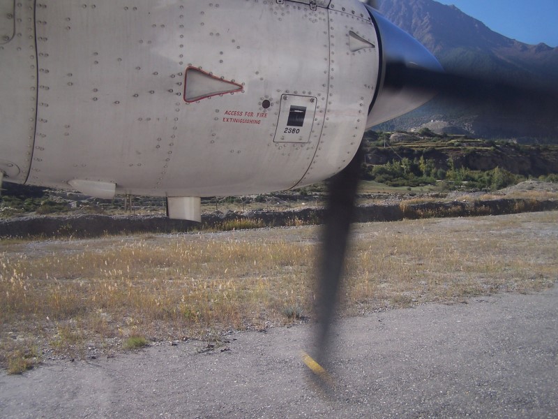 In Pokhara bezog ich Unterkunft in der freundlichen Butterfly Lodge mit dem netten Besitzer Govinda Raj Pahari. Am Donnerstag den 05.10. begann der eigentliche Trekkingzeitraum mit einem morgendlichen Flug von Pokhara nach Jomsom. Da meine beiden Trekkingtouren von Jomsom aus starten würden, hatte ich alles komplett dabei, also ca. 28 kg. Ich ging zur Lodge “Trekkers Inn”, die ich bereits von meinem Aufenthalt 2003 kannte und packte aus-, um und wieder ein. Zurück in der Lodge ließ ich die Trommel und eine grosse Plastiktüte mit Schalenschuhen, Zelt, Isomatte und diversen Kleinigkeiten, die ich für den Trek nach Muktinath nicht benötigen würde. Kurz vor 10 Uhr ging es dann mit einem verhältnismäßig leichten Rucksack von ca. 13 kg endlich los.