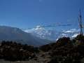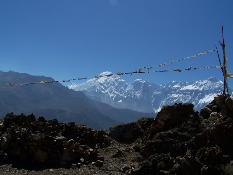 Am nächsten Tag machte ich von dort einen Tagesausflug. Mein Ziel war ein Hügel auf der anderen Talseite, genau gegenüber von Kagbeni. Eigentlich wollte ich den Berg umrunden, aber der Lodgebesitzer riet mir davon ab, weil der Weg teilweise durch eine “restricted Area” führt, für die ich kein Permit hatte. Also bin ich den Weg zurück nach Eklebhatti. Kurz nach dem Ort führt eine Hängebrücke auf die andere Talseite zu einem Dorf namens Phalyak. Ungefähr auf halbem Wege von der Brücke zum Dorf bog ich rechter Hand (nordöstlich) ab und erklomm den vor mir liegenden Hügel weglos. Oben auf 3350 m am mit Gebetsfahnen geschmückten Gipfel angekommen, bot sich ein fantastisches Panorama (Aufstiegszeit 1.45 h).
