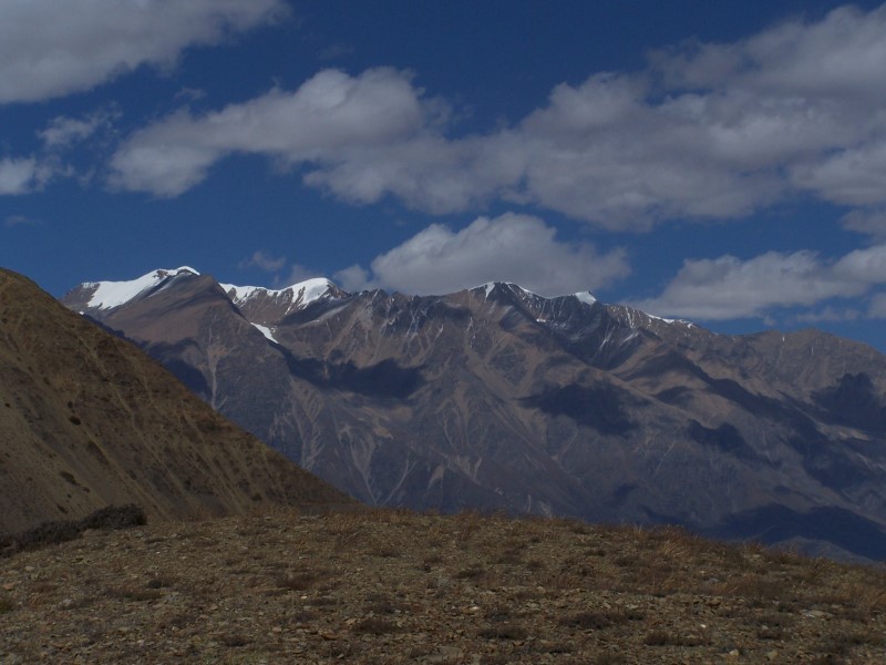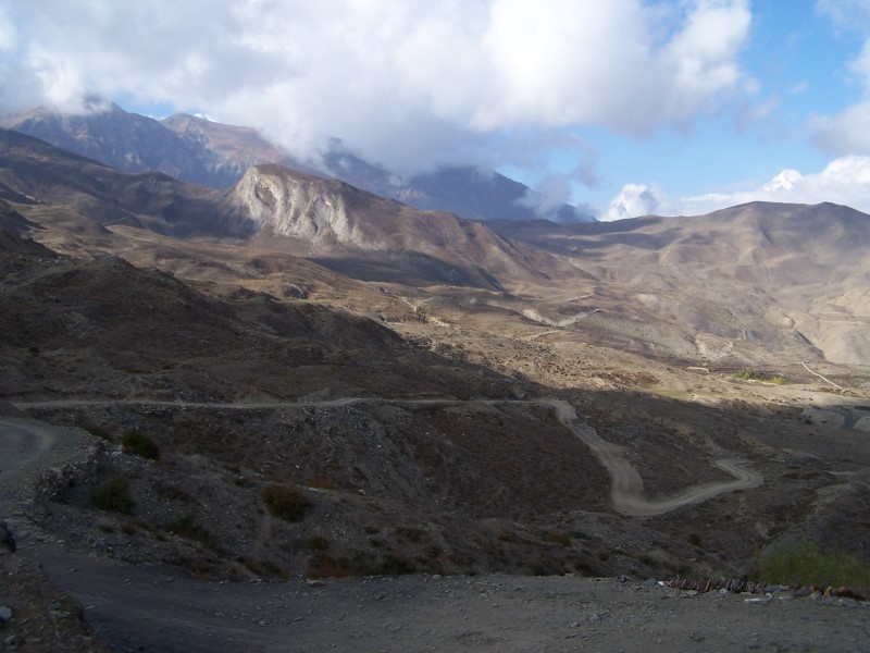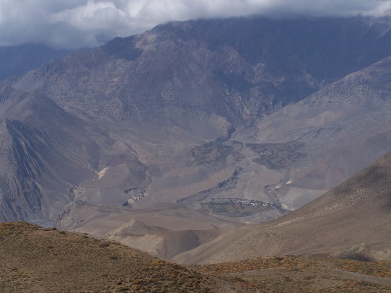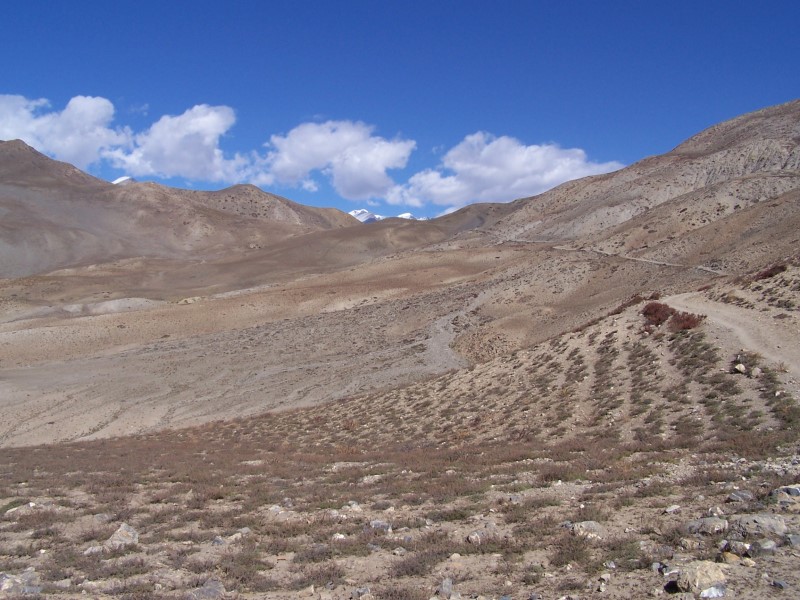 Der nächste Morgen begann auch wiederum mit erstaunlich viel Bewölkung. Meine heutige Tour führte mich den Weg Richtung Lupra. Diese Ortschaft liegt in einem Seitental parallel zu Mukinath, Richtung Südwesten. Hinter Lupra erreicht man das Kali-Gandaki Tal im nächsten Seitental zwischen Eklebhatti und Jomsom. Der Weg ging zunächst leicht abwärts, um dann nahezu eben einer Hügelkette zuzustreben. Die Hügelkette, an deren höchster Stelle ein kleiner Pass gelegen ist (3930 m), muss durch einen kleinen Schlussanstieg erklommen werden. Auch dieser Weg ist kaum begangen und mir begegnete wiederum außer einem Schäfer mit seiner Herde niemand.
