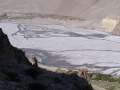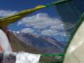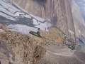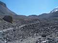 Um nicht den Fehler von 2002 zu wiederholen und in finsterer und eiskalter Nacht zu starten (damals sind meine Hände und Füße beim Aufstieg stark ausgekühlt und ich hätte deshalb fast aufgegeben) bin ich um kurz nach 7 h gestartet. Die Lodge am hinteren Talschluß erreichte ich bereits nach 55 Minuten. Nach den Hütten wird der Weg richtig steil und führt zunächst ohne irgendeine Flachpassage zum verschnaufen hinauf. Nach einer Stunde Gehzeit war ich auf 4250 m (550 HM/h). Auf ca. 4600 m passiert man rechter Hand ein kleines Plateau, wo gezeltet werden kann, allerdings ohne Wasserstelle. Nach genau 2 Stunden erreichte ich eine Höhe von 4800 m (550 HM/h). Dort ist auch die Stelle, wo der Weg abknickt und man von oben kommend den Grat hinauslaufen muss, um einen Blick hinüber zum Dhaulaghiri zu haben. Hier kamen mir die ersten Trekker von oben entgegen. Der Weg wird nun insgesamt flacher.