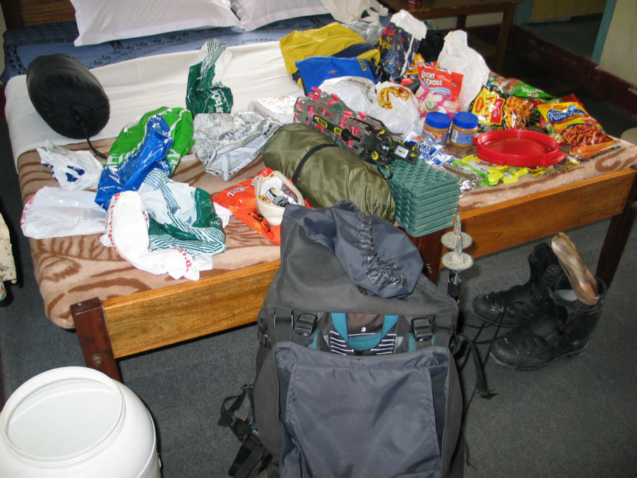 Der zweite Trekkingteil unterscheidet sich in einem wesentlichen Punkt vom ersten Trek zum ABC: es ist kein Lodgetrekking, sondern eine Tour im “Expeditionsstil”, d.h. auf dem Weg zu meinem Zielgebiet, dem Hidden Valley, gibt es keinerlei Infrastruktureinrichtungen, also keine Lodges, einfach nix ! Das bedeutet, das ich alles selbst mitnehmen muss, was für einen 10-tägigen Aufenthalt im Himalaya benötigt wird: neben den “üblichen” Trekkingsachen auch ein Zelt, Kocher, Kochtopf, Lebensmittel, Schalenschuhe, Steigeisen etc. Das summierte sich zu einem Startgewicht des Rucksackes von ca. 25 kg.