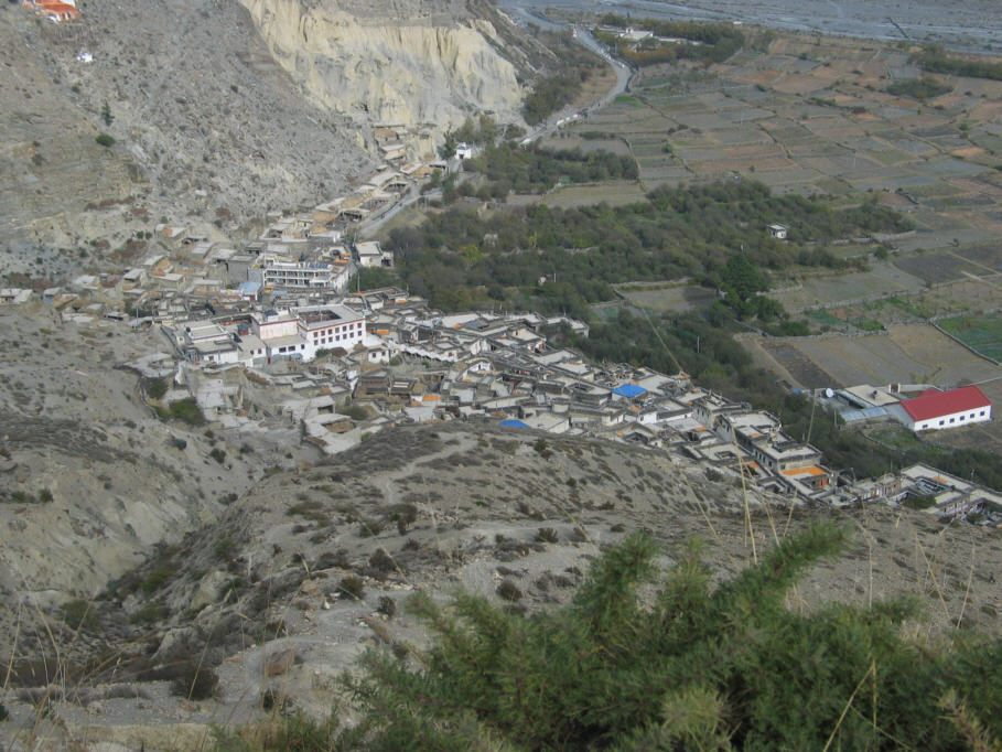 Am nächsten Morgen wurde es nach dem Frühstück in der Lodge endlich ernst. Der Weg führt von der Ortsmitte in Marpha stetig steigend, einen staubigen, aber gut gangbaren Weg aufwärts, zunächst bis zu einem schon vom Ort sichtbaren Chorten (2840 m).