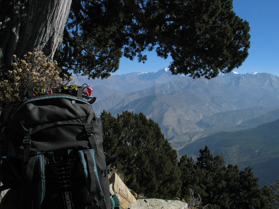 Die nächste Pause machte ich an einer Stelle, wo der Weg an der oberen Kante des erklommenen Kessels sich wieder nach Westen neigt und einen freien Blick ins Kali-Gandaki Tal ermöglicht (3565 m).