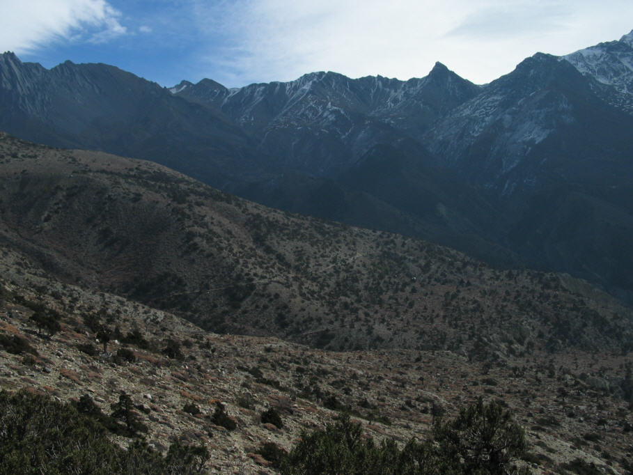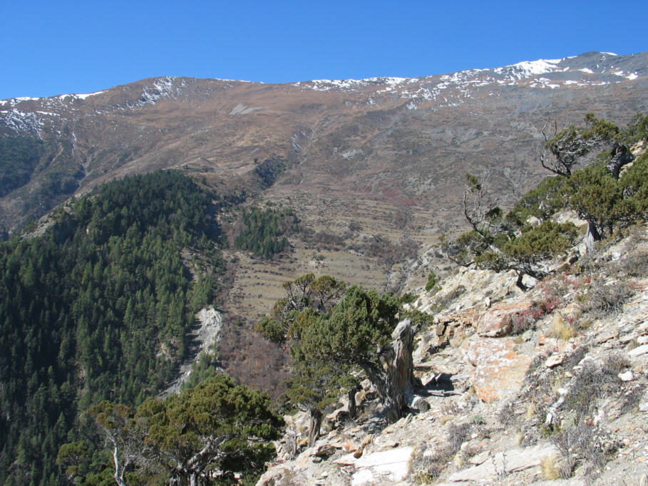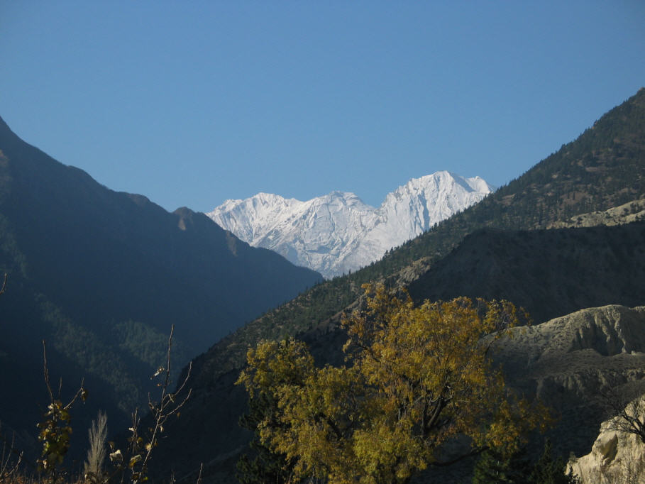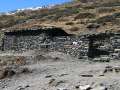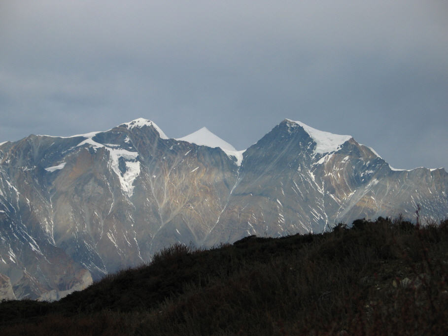Am nächsten Morgen gingen wir um ca. 8 Uhr los. Der Weg führte über intensiv bewirtschaftete Felder hinauf nach Thini. Der gut ausgebaute staubige Weg führte am Hang entlang aufwärts und knickt an einem markanten Punkt knapp unterhalb von 3000 Metern nach Osten ab. Von dort ist zum ersten Mal das Tal einzusehen, in das der Weg nun führt und an dessen Ende der Mesokantu-La einen Passübergang zum Tilicho-Lake ermöglicht. Man gelangt zu an den Fels angelehnten unbewirtschafteten Steinhütten (ca. 1,5 Stunden ab Jomsom). Mein Guide meinte dann einem “Upper-Way” folgen zu müssen und wir verließen den normalen Weg. Anfangs noch in Ordnung, stolperten wir später mehr oder minder ständig durch stachelige Büsche, da kein Weg mehr vorhanden war. Wie ich beim Hinuntergehen auf dem Normalweg feststellte, war diese Aktion völlig überflüssig, da logischerweise dieselben Höhenmeter erklommen werden müssen und sich beide Varianten weiter oben wieder vereinten. Eine weitere Bestätigung für meine Abneigung mich kritiklos irgendwelchen Guides auszuliefern.