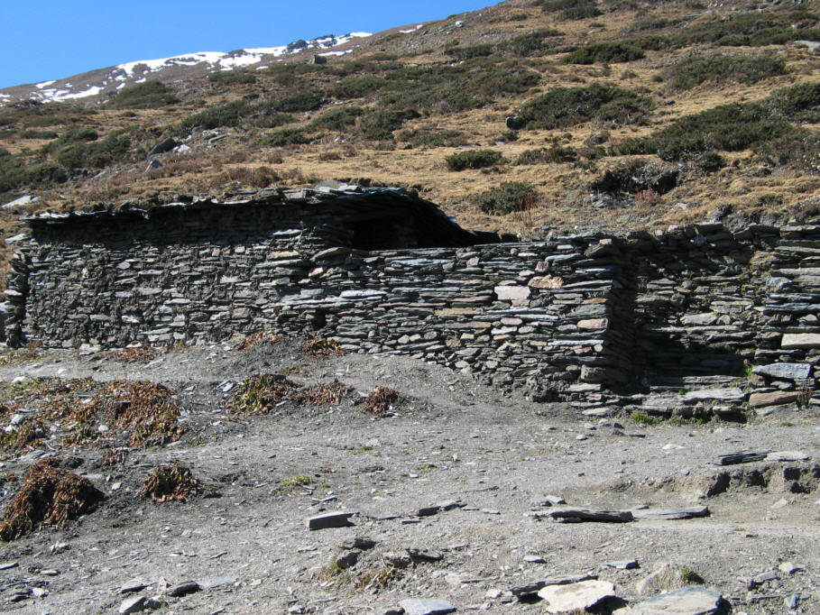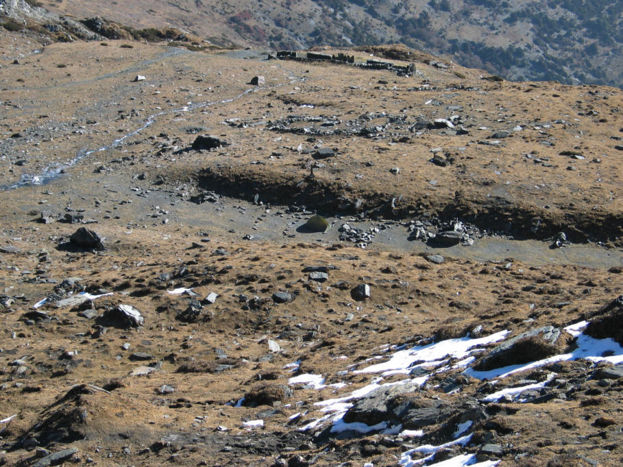 Vielleicht lag es an der miesen Nacht. Aber der nächste Tag war trotz strahlend sonnigem Morgen nicht “mein Tag”. Die Etappe war verhältnismässig kurz. Ich wollte weiter aufsteigen, bis zum nächsten Zeltplatz nach Yak Kharka (4170 m). Leider erwischte ich auch hier nicht den korrekten Weg und stieg zu weit links (südlich) am Hang auf. Hier war überhaupt kein Weg und dementsprechend mühselig kämpfte ich mich nach oben. Oft musste ich schon nach wenigen Metern stehenbleiben, durchatmen, versuchen einen gangbaren Pfad durch die verkrüppelten Latschen zu finden. Das ist wesentlich anstrengender, als einem vorgegebenen Weg einfach nur zu folgen. Weiter oben kreuzte ich den Hang wieder nach Norden und erreichte eine Steinhütte. Auf den Steinplatten vor der Hütte sank ich erschöpft nieder und blieb fast eine Stunde in der Sonne dösend liegen. Von hier war es nun nicht mehr weit bis zum Zeltplatz in Yak Kharka. Auch hier konnte ich mir den besten Platz aussuchen, da auch hier niemand ausser mir war.