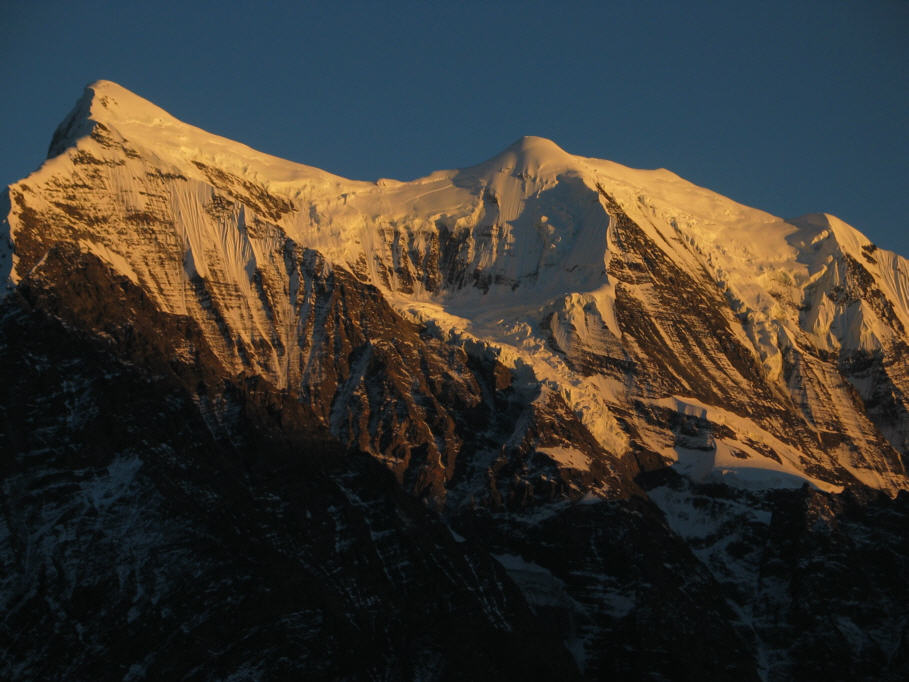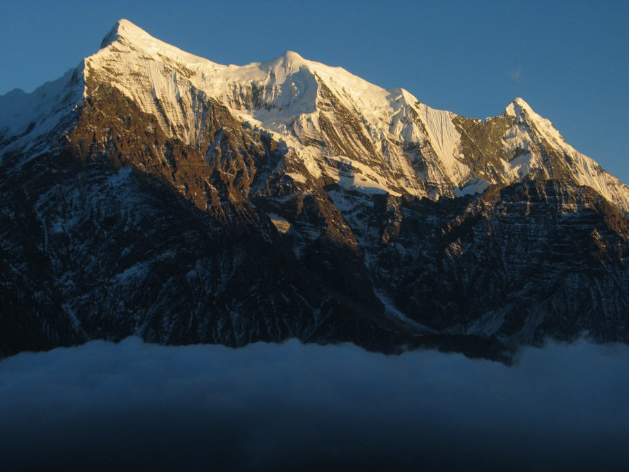 Der Graupel schien dann mehr in Schneefall überzugehen und der Wind drückte den Schnee zunehmend gegen die äußere Zeltplane. Ich klopfte periodisch immer wieder die Zeltplane ab, was aber dazu führte, das sich rings um das Zelt noch mehr Schnee sammelte. Irgendwann glaubte ich dann einen hellen Lichtblitz bemerkt zu haben. Dann wieder ein Zucken, also doch keine Halluzination. Kein Problem sagte ich mir, tut dir schon nichts. Doch dann kam ein heftiger Donnerschlag dazu. Periodisch sich wiederholend. “Operation Wintergewitter”. Spätestens da fühlte ich mich reichlich “unkomfortabel” und ich wünschte mir, nicht mehr in einem Zelt allein in fast 4800 Meter Höhe zu liegen. Gedanken an den von einem Blitzschlag am Manaslu erschlagenen Friedl Mutschlechner, an die Tragödie von Kurt Diemberger am K2 oder die Schneekatastrophe im November 1995 in Pangka (wo eine ganze Trekkinggruppe nach heftigsten Neuschneefällen von einer Lawine verschüttet worden ist) durchzuckten meinen Kopf. Was machen ? Alles zusammenpacken, nachts absteigen, zumindest bis zu der Gruppe nach Yak Kharka ? Oder doch abwarten, zumindest bis zum Tagesanbruch, bis ich bei Tageslicht die Situation besser einschätzen könnte, wohlwissend, dass dann noch mehr Schnee liegen würde ? Ich zwang mich wach zu bleiben. Ich überlegte wo die Allwetterhose und die Gamaschen im Rucksack sind. In welcher Reihenfolge ich was anziehen würde. Wie ich im Schneesturm alles packen würde. Oder einfach das Zelt stehenlassen ? Wie wohl der Abstieg verlaufen würde. Ich hatte jegliche Vorstellung darüber verloren, wieviel es mittlerweile geschneit haben könnte. Ca. um 4 Uhr morgens lies der Schneesturm nach. Da schlief ich dann für ca. 2 Stunden ein.