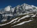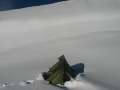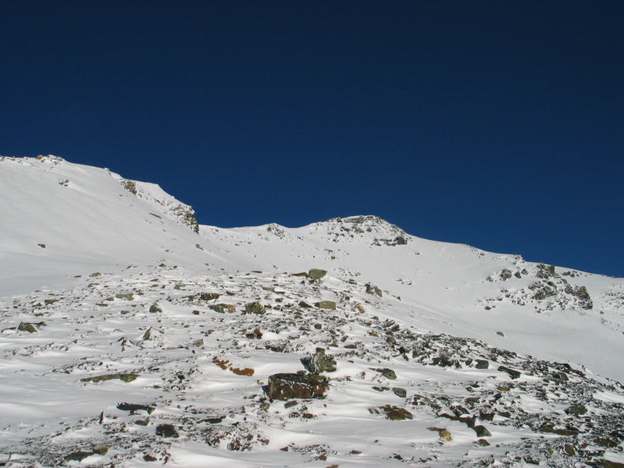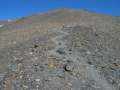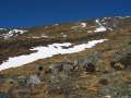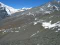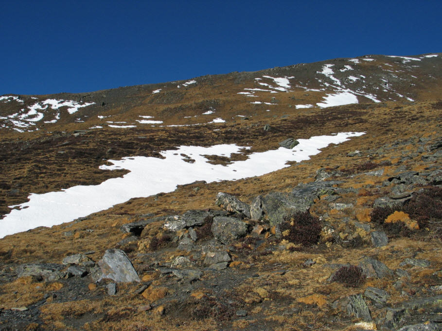 Nach weiteren ca. 100 Höhenmetern, die an einem Schutthang aufwärts führten, gelangte ich rechts (nordöstlich) des Weges zu einem etwas versteckten Platz hinter dem eigentlichen Schutthang. Dort gab es auf der sonnenabgewandten Seite noch Schneereste und mehrere kleine Flächen, die das Aufstellen eines kleinen Zeltes erlauben würden. Außerdem war dieser Platz etwas ausserhalb der Hauptwindrichtung. Diesen Platz reservierte ich mir bereits gedanklich für den nächsten Tag, da ich mit Gepäck hierher zurückkehren wollte.