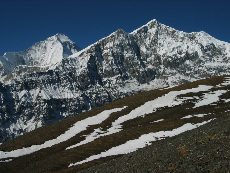 Dabei folgte ich dem Weiterweg Richtung Dhampus Pass. Zunächst erreicht man einen ersten Grat (4370 m) an einer Stelle bei einem großen Felsblock. Der Weg zieht sich von hier den Grat entlang nach oben, bevor dieser leicht links haltend (südwestlich) in eine Art Hochtal führt. Von hier zeigt sich ein noch höher verlaufender Grat, der nun angesteuert wird. Man erreicht diesen Grat bei einem Steinmann (4650 m), den man bereits von weiter unten erkennen kann. Nach wenigen Schritten, bei einem größeren Felsen, ergibt sich zum ersten Mal ein grandioser Blick hinüber zum Dhaulagiri und zum Tukche Peak.