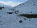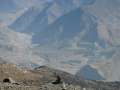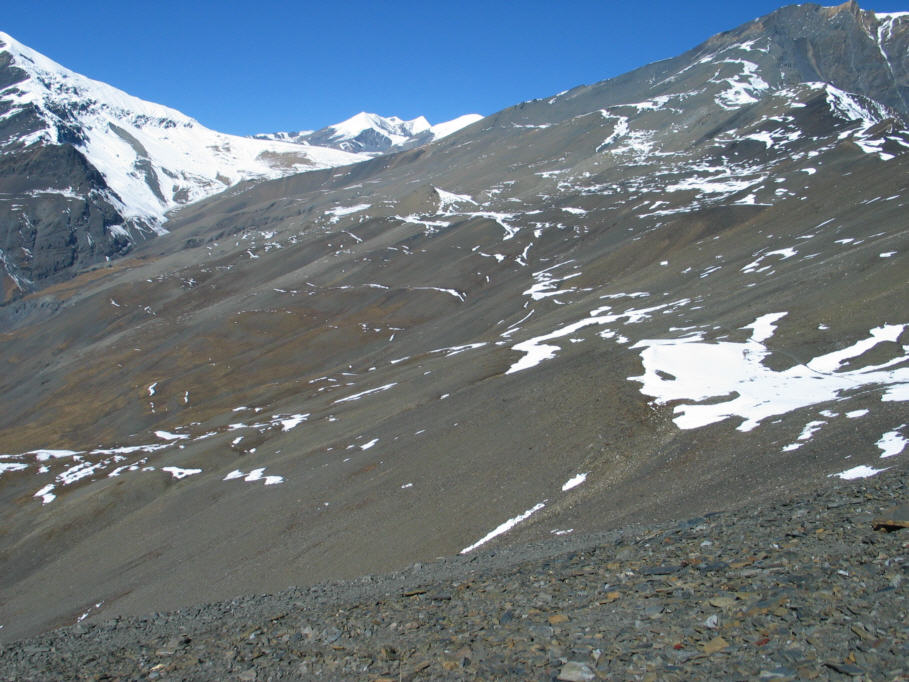 Da hier eine grössere Gruppe in der vergangenen “Sturmnacht” zeltete, die bereits auf dem Weg nach Marpha war, wusste ich, dass ich ab hier nurmehr einem getrampelten Pfad im Schnee folgen musste. Pflichtbewusst erinnerte ich mich an meine vergrabene Jutetasche mit den Abfällen und den Lebensmitteln. Eine viertel Stunde suchte ich im verschneiten Gelände nach ihr, konnte sie aber einfach nicht mehr aufspüren. Dann machte ich mich an den weiteren Abstieg, der nun wesentlich einfacher war, da ich eine Trampelspur hatte. Die letzten Schneereste zogen sich bis auf ca. 3700 m hinunter. Mit einem letzten Blick zurück ins weite Hochtal mit dem Abstiegsweg machte ich nochmals Rast.