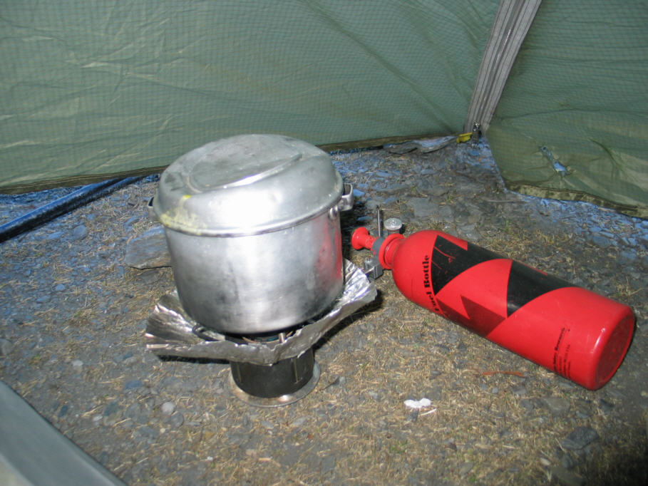 Etwas weiter oberhalb zeigt sich zum ersten Mal ein weites Hochtal, in dem auch Alubari, mein Tagesziel liegt. Mit dem Rücken ging es wieder besser. Leider stieg ich etwas zu hoch auf und musste dann am Hang wieder weglos absteigen, was mit dem Rucksack nicht so lustig ist, da jeder Schritt gut ausbalanciert sein muss. Kurz vor 12 Uhr erreichte ich Alubari (3750 m). Dieser Platz besteht aus ausgedehnten, terrassenförmig angelegten Flächen, auf denen gezeltet werden kann. Es gibt mehrere Wasserläufe womit die Wasserversorgung hier sichergestellt ist. Ich suchte einen Platz für mein Zelt, etwas auf der windabgewandten Seite eines Hügels. Ausser mir war niemand hier. Dummerweise habe ich das Zelt etwas schräg am Hang aufgestellt, was sich später noch rächen sollte. Zunächst konnte ich noch etwas im Freien sitzen, später am Nachmittag ging ich daran, mir mein Abendessen zu kochen. Während das Frühstück aus 50 g Brot und 50 g Erdnusscreme bestand und es tagsüber 5 verschiedene Müsliriegel gab, so kredenzte ich mir jeden Abend eine warme Mahlzeit. Diese bestand aus verschiedenen Fertiggerichten, z.B. Emmentaler Makkaroni oder Nudeln Barbeque Style (natürlich nicht mit einer von
