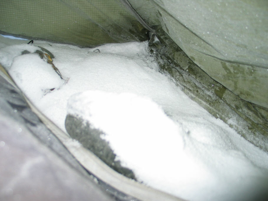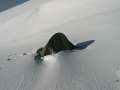 Da ich nicht mit Graupelwetter gerechnet hatte, befestigte ich zwar die Heringe mit Steinen, jedoch konnten die Graupelkörner ins Vorzelt durch den Wind getragen werden, dort wo auch mein Rucksack und der Brenner samt Kochzubehör lag. Als es dann um ca. 18 h finster war und ich darauf wartete, dass sich der Sturm und das Graupeln langsam beruhigen würde, geschah mehr und mehr das Gegenteil. Der Wind wurde immer heftiger, das Prasseln der Graupelkörner auf die Zeltplane immer lauter. An Schlaf war selbstverständlich unter diesen Umständen nicht zu denken. Ab und zu richtete ich mich im Schlafsack auf, nahm die Stirnlampe und leuchtete ins Vorzelt. Mehr und mehr war dort alles weiss und alle Gegenstände nurmehr zu erahnen.