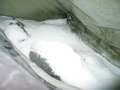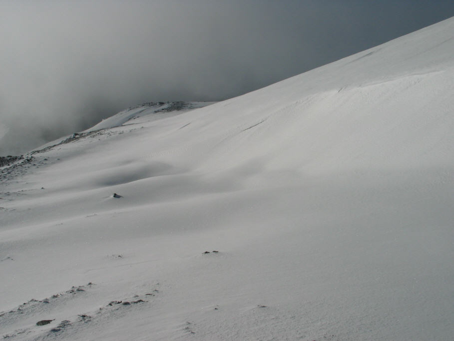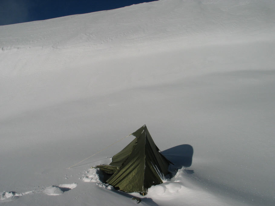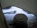 Ab ca. 16 h wurde das Graupeln heftiger, einhergehend mit kräftigen Windböen. Ich überlegte, ob ich mir zum Teekochen noch Schnee besorgen sollte ? Da mit jedem öffnen des Zeltes und hinausgehen auch Graupelkörner und damit Feuchtigkeit ins Zeltinnere getragen wird, fällt die Entscheidung nicht so leicht. Ich entschied mich dann doch dafür hinauszugehen. Der Schnee, der Mittags noch leicht angetaut einfach zusammenzukratzen war, war mittlerweile wieder hart gefroren. So musste ich kräftig mit dem Topfdeckel schürfen und mehrmals hin und her laufen, um den Kochtopf mit Schnee und Eis zu füllen.