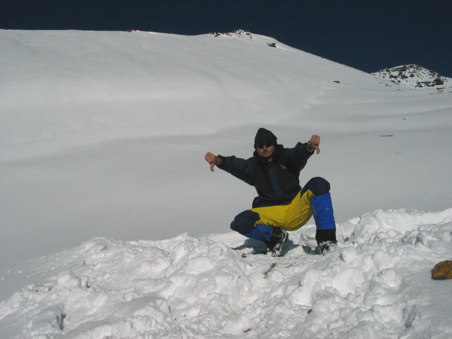 Ich kehrte dann auf den Hauptweg am Schutthang zurück und stieg weiter aufwärts. Man passiert einen grossen Steinhaufen und bald darauf wird der Punkt erreicht, von wo aus ein erster ungehinderter Blick ins Tal hinein zum Dhampus Pass (der Pass selbst ist nicht sichtbar !) möglich ist. Hier auf 4870 m rastete ich und genoss den fantastischen Ausblick bei fast Windstille. Es lag sehr wenig Schnee in diesem Bereich, sodas ich davon ausging, keine größeren Probleme auf dem Weiterweg bis zum Dhampus Pass zu bekommen. Ohne Gepäck soll der Pass von hier aus in 3 Stunden erreichbar sein.