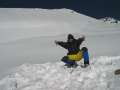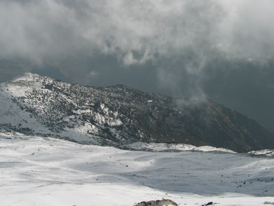Um ca. 7 h zog ich mich dann nach dem vorbereiteten System an. Als ich mir die Trekkinghose anzog, ratsch, Reißverschluss kaputt. Das passte. Dann raus aus dem Zelt, um die “Bescherung” anzusehen. Zum Hang hin eine einzige weisse Fläche. Zur Gratkante guckten die Steine heraus, da dort der Sturm alles frei geblasen hatte. Um das Zelt herum ca. 30-50 cm Schnee. Die Sonne schien. Richtung Yak Kharka und Tal hielten sich jedoch Wolken.