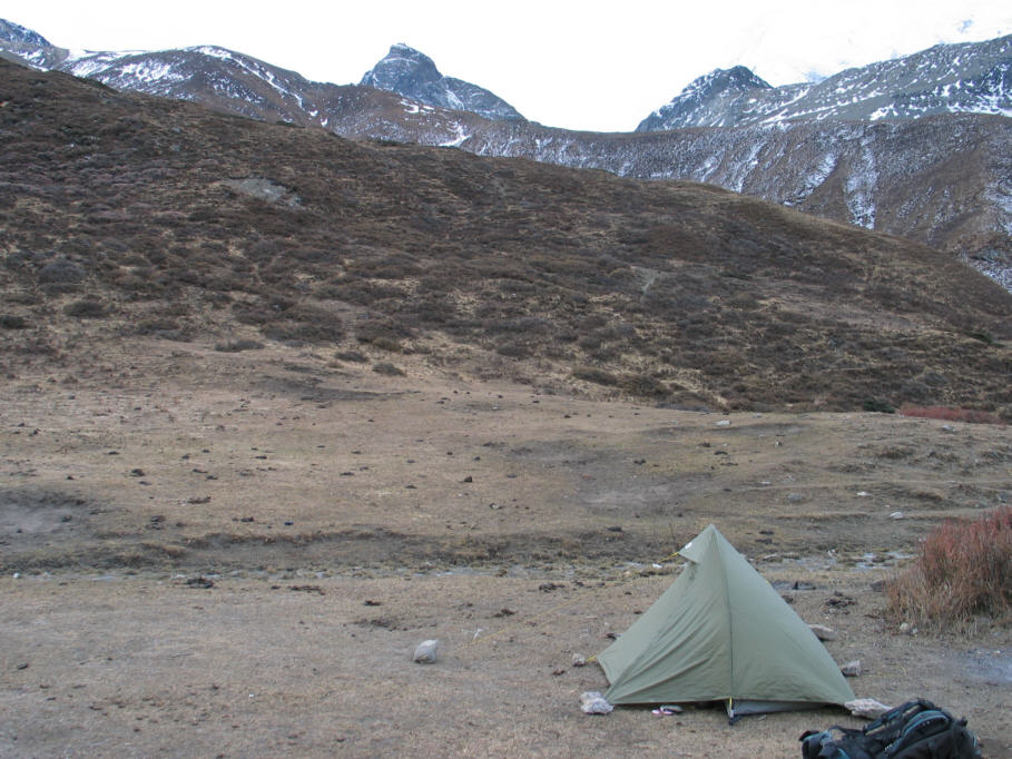 Wie geplant ging ich an diesem Tag den Weg, den ich bereits am Vortag gegangen war, bis zu dem von mir entdeckten Zeltplatz. Hier war ich auch wieder allein. Ich bemühte zunächst die medizinische Abteilung zur Verarztung meiner Blasen. Danach zog ich mein warmes Gericht vom Abendessen vor und kochte. Dies dauerte, da ich zunächst Schnee schmelzen musste, entsprechend länger. Da ich aber in Yak Kharka meinen Brenner noch repariert hatte (MSR XGK II, Dichtung an der Pumpdüse), feuerte er jetzt wieder kräftig. Es war bereits kurz nach Mittag bewölkt und Wind kam auch auf. Eigentlich bleibt nur ein akzeptabler Aufenthaltsort: der Schlafsack ! Ein bisschen Graupelkörner tröpfelten auf die Zeltplane, als ich mein Tagebuch schrieb. Nichts beunruhigendes. Ich plante die Etappe für den nächsten Tag. Da wollte ich bis Kalopani gehen, welches ca. 1 Stunde vor dem Dhampus Pass liegt. Dort sollte es auch einen Zeltplatz mit Wasserversorgung geben. Daneben beschloss ich, die Schalenschuhe wieder im Rucksack verschwinden zu lassen und lieber wieder mehr Gewicht zu schleppen, dafür aber in bequemen Schuhen zu gehen.