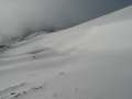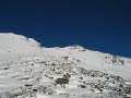 Ein Vorteil war es, dass ich mir den Weg beim Hochgehen eingeprägt hatte. Davon war aber leider nichts mehr zu sehen. Da es zum Teil zu heftigen Schneeverfrachtungen bzw. -ansammlungen gekommen war, konnte ich nicht direkt so absteigen, wie ich heraufgekommen war. Ich suchte mir immer eine Linie im Gelände, die nicht zu steil und wo der Schnee auch nicht zu tief war. Trotzdem sank ich öfters bis zum Knie ein. Problematisch war der Untergrund, da ich nie wusste, ob nicht ein glatter Stein unter dem Schnee sein würde, der eine ideale Rutschbahn sein würde, zumal ich mit dem schweren Rucksack nicht wirklich ruckartige Gegenbewegungen ausführen konnte. Froh war ich, als ich Yak Kharka erreichte.
